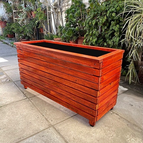 Macetero de madera, interior impermeabilización plástico reciclado polietileno y exterior terminación barniz marino.