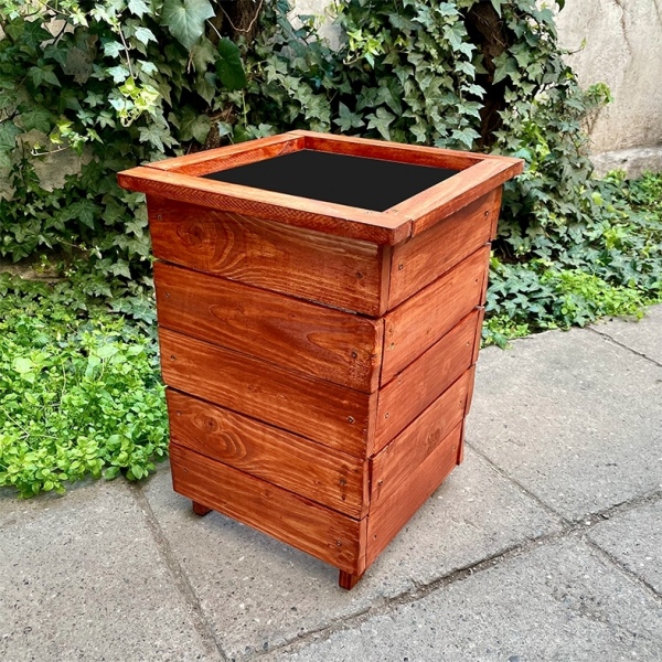 Macetero de Madera, interior impermeabilización plástico reciclado polietileno y exterior terminación barniz marino.