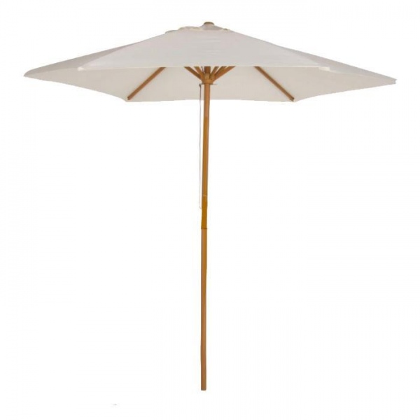Quitasol Madera 2.6m de diámetro y un alto máximo de 2.4m, brinda amplia protección a juegos de mesas y sillas de exteriores. Cubierta de Lona Sintética certificada con Filtro UV. Diámetro palo: 5cm